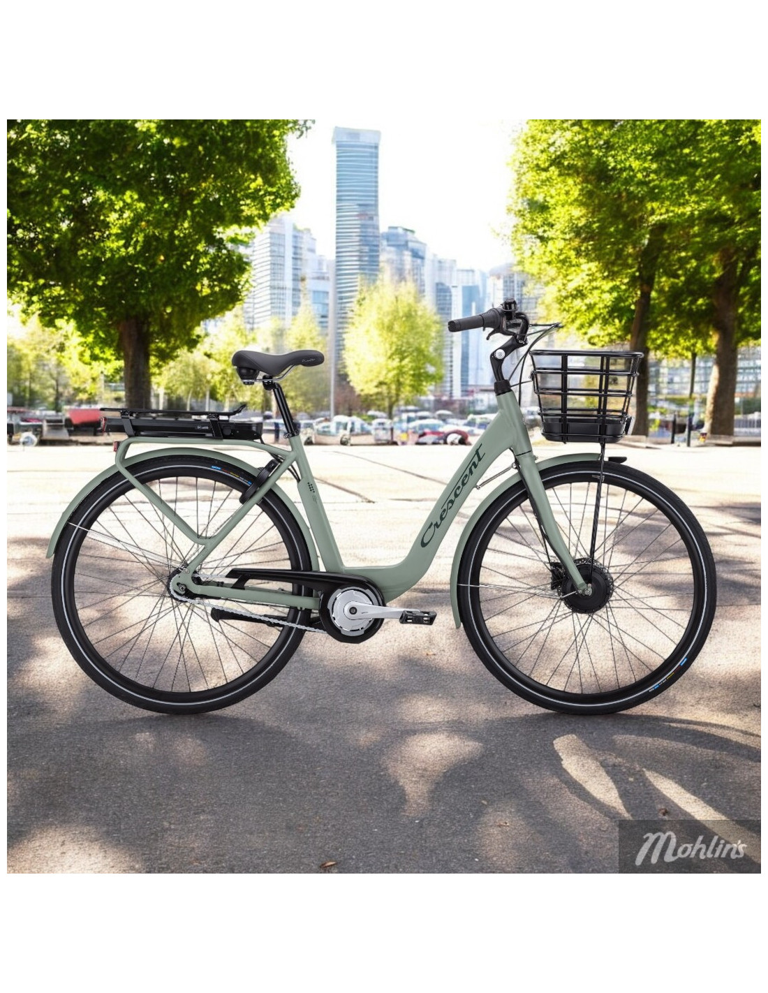 Crescent Elcykel Elina 7-vxl 55 cm Dusty Green Frontmotor Fotbroms Citybike