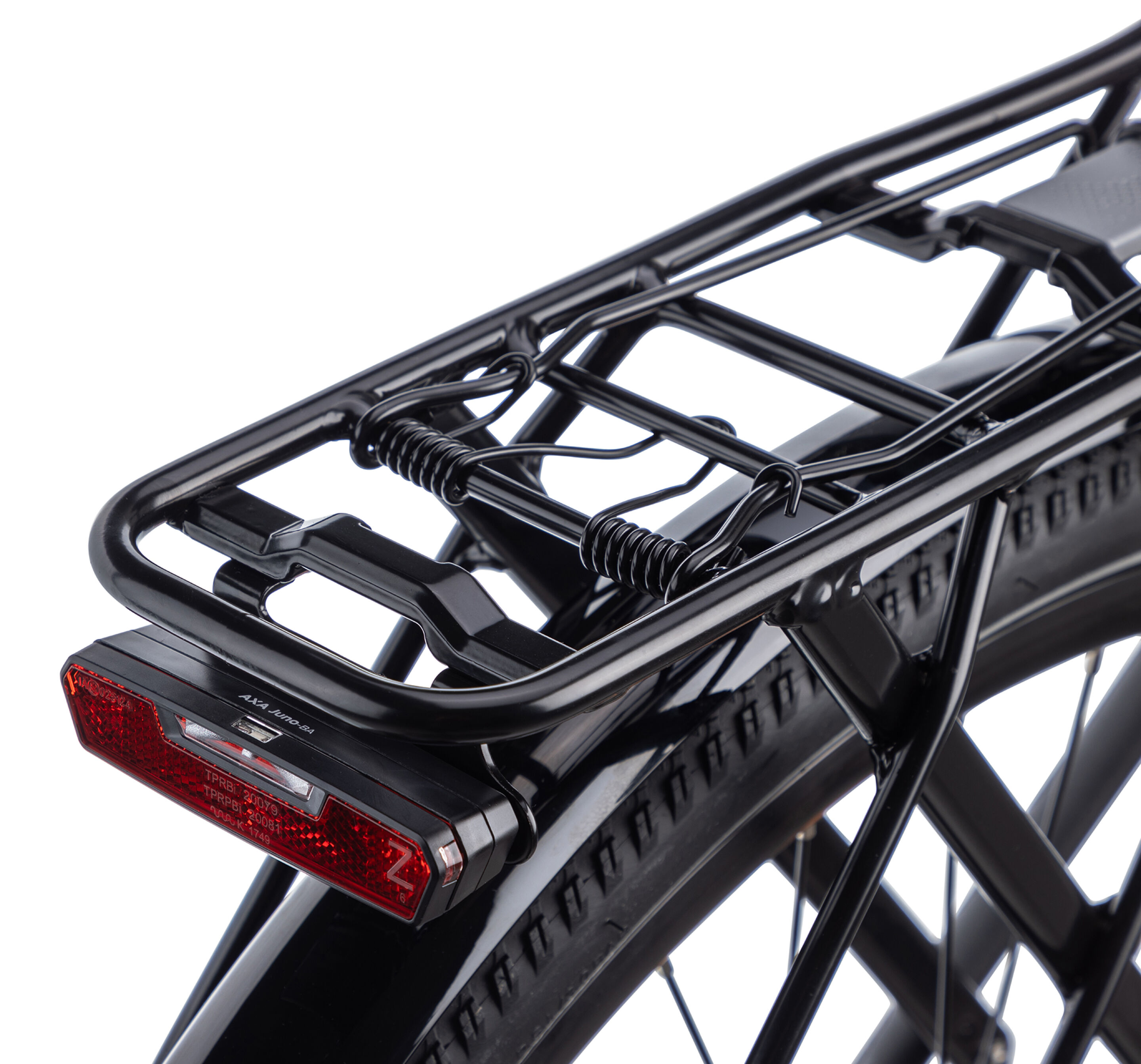Komfort & utrustning: Dämpad framgaffel · Styre 640 mm · Sadel TEC Obvius 199 · Handtag Spectra låsbart ergonomiskt · Skärmar SKS Bluemels 46mm · Stöd ATRAN MOVE · Pakethållare AVS · Lås AXA Solid + · Belysning AXA Nox batterilampa fram, AXA-JUNO-B med reflex bak