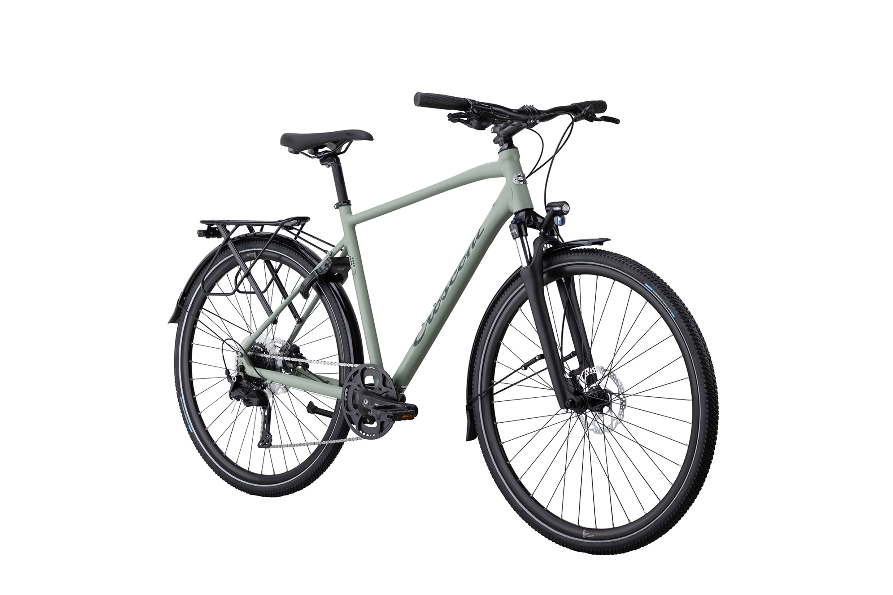 Denna hybrid är utrustad med skärmar, stöd och en pakethållare med AVS-snabbfästen, som gör att du kan sätta på väska eller korg med bara ett klick.