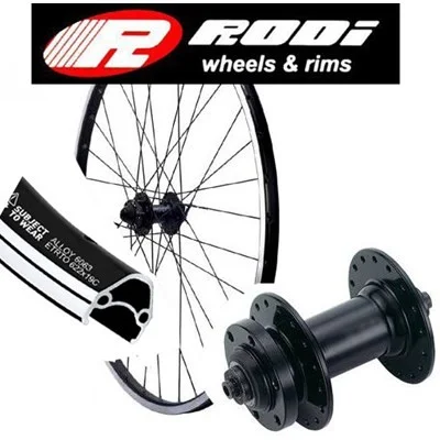 Rodi. Framhjul 26" 559 Dubbelbottnad Svart. Fälg: 36-Håls svart dubbelbottnad CNC-bearbetade sidor, 19-559. Nav: OLD: 100 mm. Även för skivbroms, för snabbkoppling. Ekrar: 36 st. Svarta. Hjulet fungerar både för fälgbroms och skivbroms.
