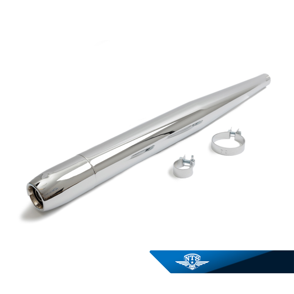 Ljuddämparen är utformad för 32 mm anslutning och kombinerar effektiv ljudreducering med ett tidstypiskt utseende som passar perfekt på äldre modeller.