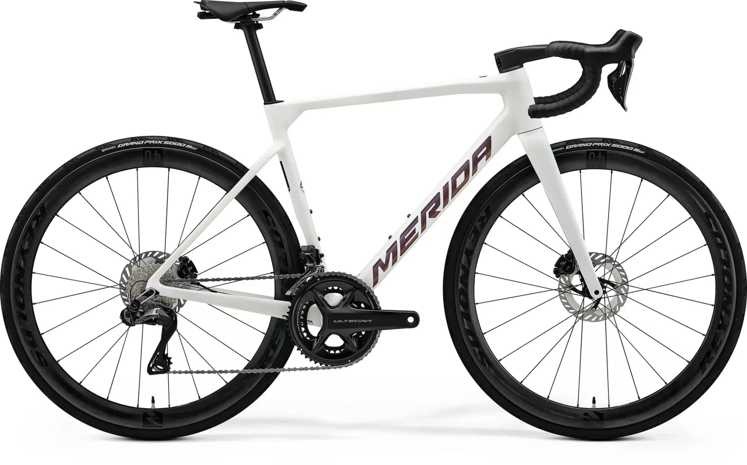 Lätt CF3-kolfiberram (ca 997 g – i storlek M) med tävlingsbeprövad geometri (identisk med REACTO) Shimano Ultegra Di2 12-växlad drivlina MERIDA TEAM SL 1P enstycks cockpit Reynolds kolfiberhjul med Continental 5000S TR 28 mm däck MERIDA TEAM SL II kolfibersadelstolpe DISC COOLER-teknologi