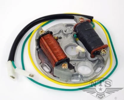 Stator/Tändplatta för CDI-tändning. Matarspole: Grön tråd. Ca 230 ohm Ljusspole: Gul tråd. Ca 0,4 ohm