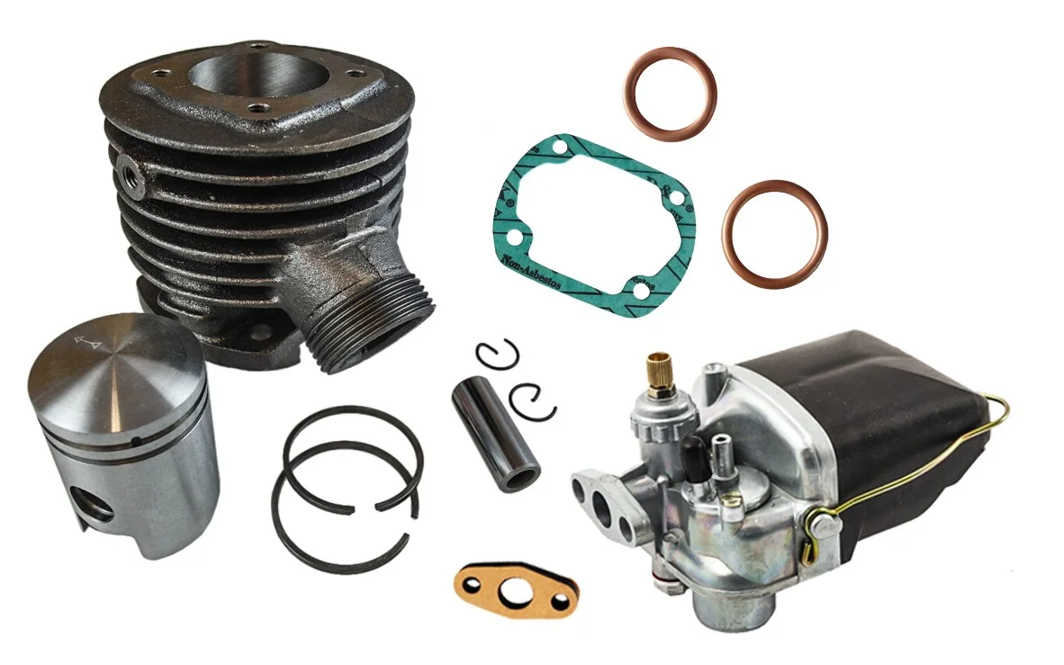 Kittet är anpassat för fläktkylda Sachs-motorer och levereras komplett med cylinder, förgasare och packningar – redo för montering.