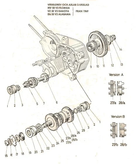 Växellådshjul. Bildnr 28b, märkt V. Orange märkning. Ersätter delar märkta V.