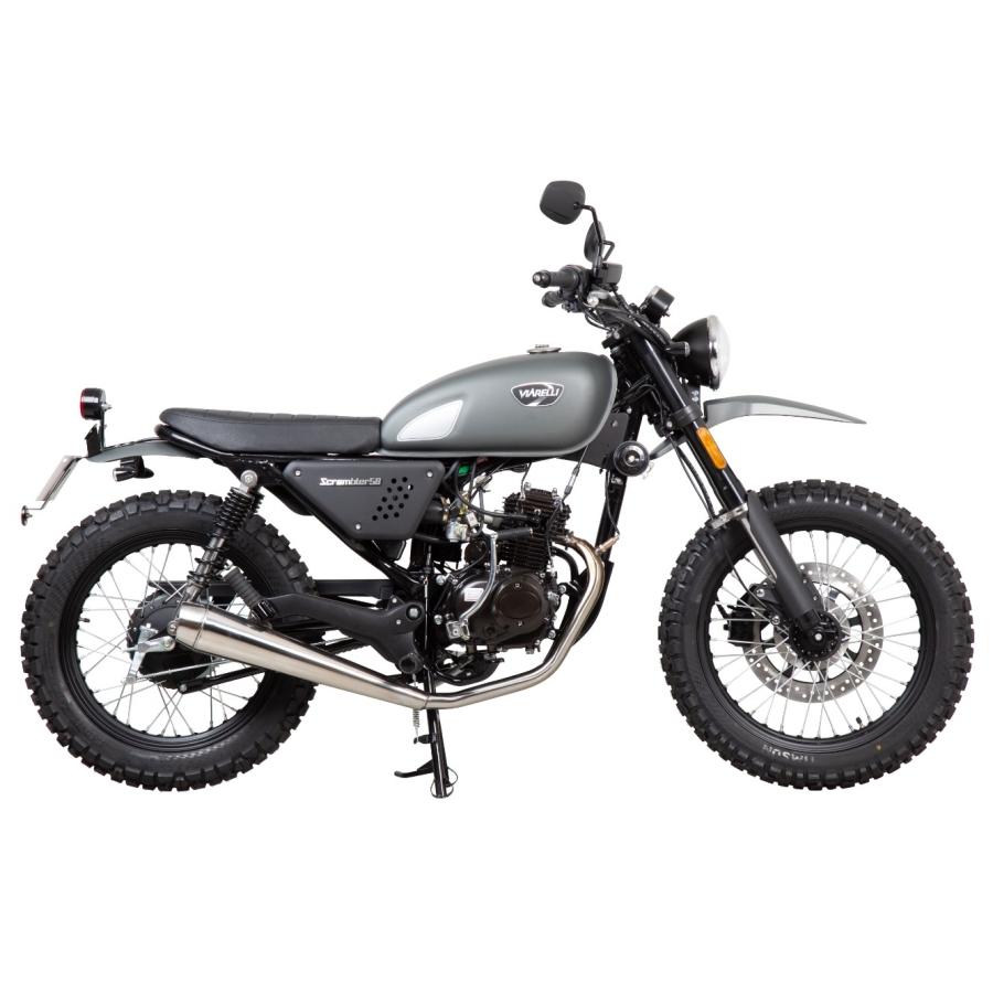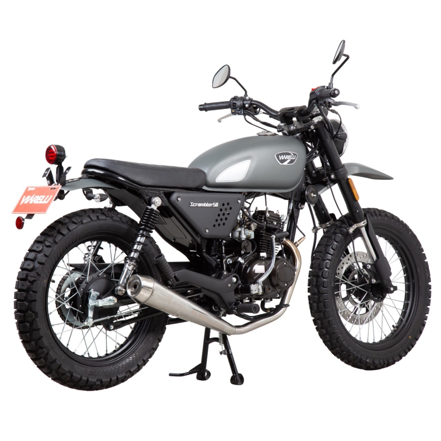 Med sin robusta konstruktion och generösa markfrigång passar Viarelli Scrambler lika bra på stadens gator som på grusvägar och mindre äventyr. Elstart i kombination med kickstart ger trygghet i alla lägen, och bromssystemet med skiva fram och trumma bak ger säker inbromsning.